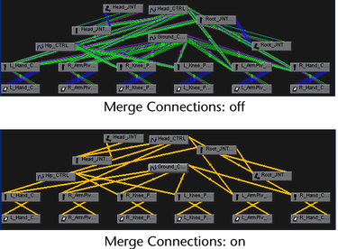 Merged connections originating from asset nodes are drawn with a small box attached. A solid box indicates that all the merged connections are published attributes. An empty box indicates that one or more of the merged connections are from unpublished internal attributes. For more information on assets, see Assets.