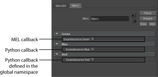 Attribute Editor view that contains three custom attribute controls. Each attribute control is created using a different callback style.