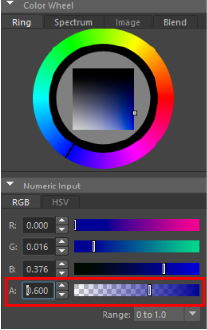The Transparency setting displays as an Alpha Channel slider in both the RGB and HSV portions of the
