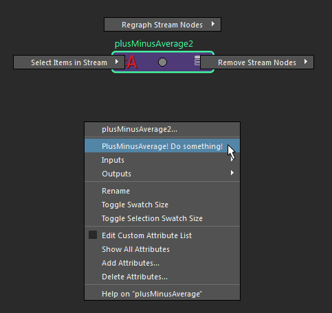 The plusMinusAverage node now includes the custom menu item "PlusMinusAverage! Do something!".
