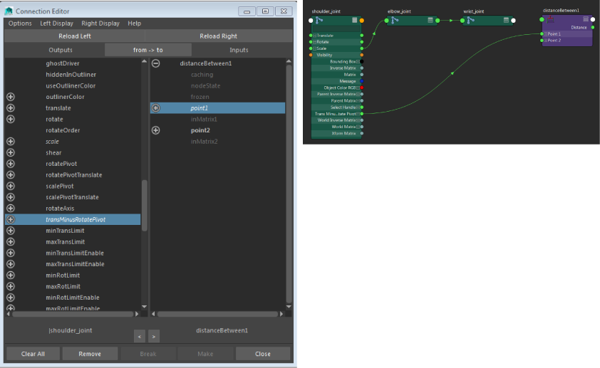 The Connection Editor window opens and the left and right columns are automatically filled with the attributes of each source.