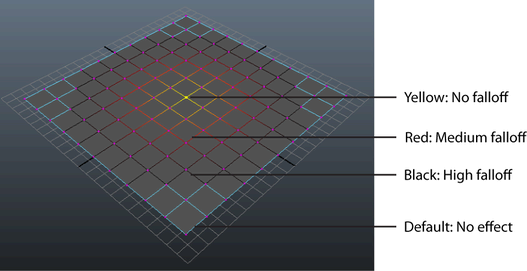 The falloff is the area surrounding the soft selected components in which a tool’s effect gradually weakens. As the falloff increases the effect of a transformation decreases. Falloff is represented by a color gradient.