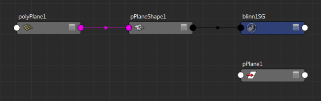 Node Editor toolbar. The shape, transform and history nodes are all shown in the graph, along with the shading group node (in this example, blinn1SG), which is connected to the shape node.