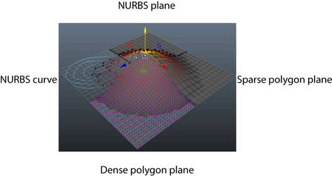 With the Global setting on, you can create smooth transformations from surfaces of different densities, but also surfaces of different types including polygons and NURBS. In the example below, Soft Selection is used to create a smooth deformation between a polygon plane, a denser polygon plane, a NURBS plane and a NURBS curve.