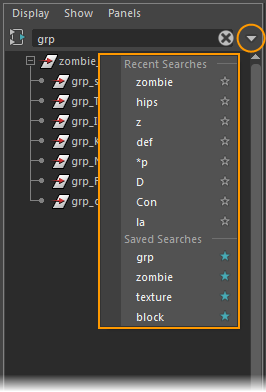 Outliner using the Search field and Searches list. The same Search field appears in the