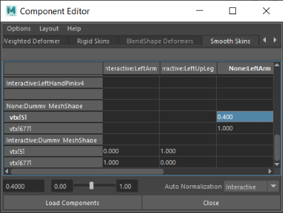 Note: The Component Editor supports multiple skin clusters, however the Total column only shows the amount of all weight on a vertex. For example, if there are two skin clusters, 2.0 is displayed in the Total column.