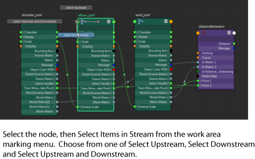 Selecting upstream and/or downstream nodes in the Node Editor or Hypershade