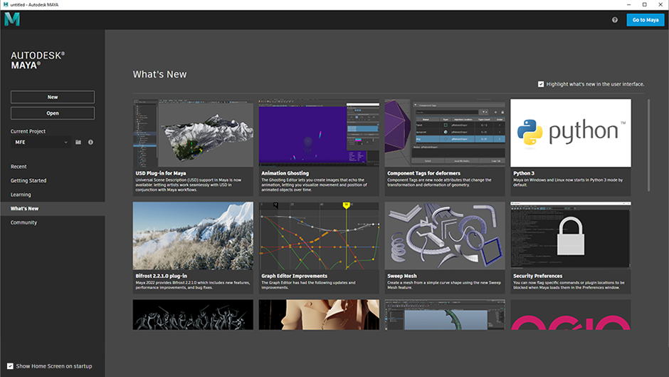 - What's New: A summary of new features in the current version (this is the default the first time you open Maya, if you choose "Experienced"). You can also toggle