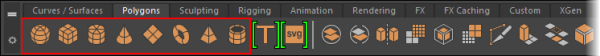 To create a polygon primitive 3D object, open the Polygons shelf and click any of the 3D shape icons at the left end.