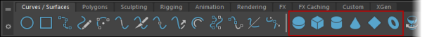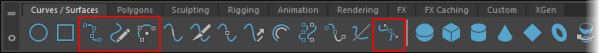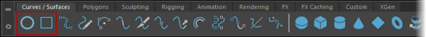 To create a primitive NURBS curve, open the Curves/Surfaces shelf and click either the Circle or Square icons at the left end.