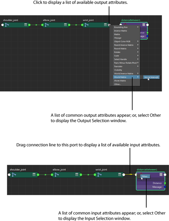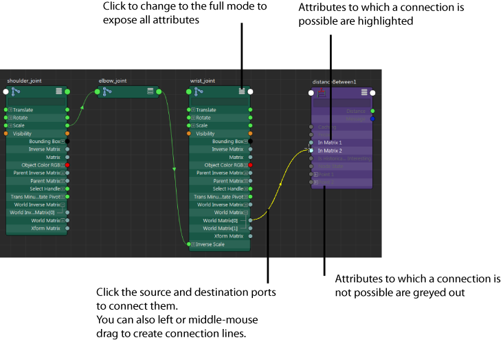 Alternatively, you can middle-mouse or left-mouse drag to create connection lines between your output and input attributes.