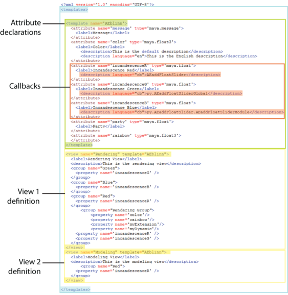 Custom Attribute Editor templates use the same XML structure as Maya asset templates and are composed of many of the same elements. The following image highlights the main sections of an Attribute Editor template.