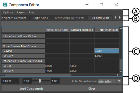 Component Editor: A. Component Editor menus, B. Component Editor tabs, C. Component Editor spreadsheet area, and D. Auto Normalization menu