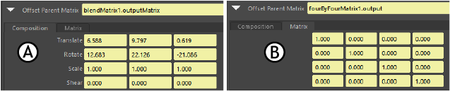 The Transform Parent Matrix tabs in the Attribute Editor: A. Composition B. Matrix
