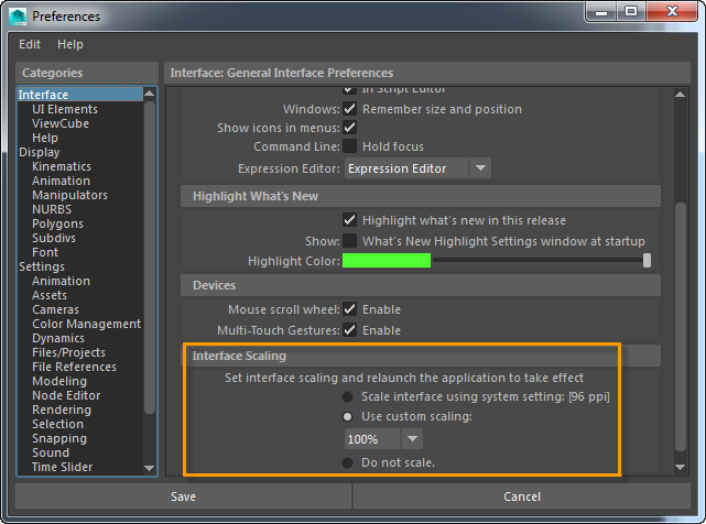 You can adjust the resolution (scale) of the Maya interface to take advantage of running on high resolution displays, like Ultra HD or 4K monitors, or Retina displays and tablets. The interface can scale to provide better readability of icons and text.