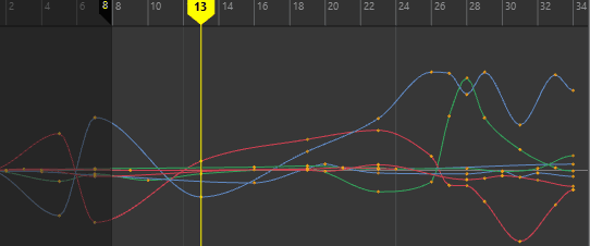 order or rotation. In this mode, the curves that define the rotation for a given node are represented in Euler-angles, interpolation is performed on each curve independently in Euler space, and keyframes may occur at your discretion—they are not synchronized with the other sibling rotation curves at the node. You can also animate a single rotation ordinate. This is the default setting.