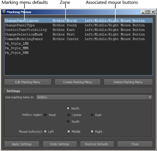 Use this editor to edit the available marking menus. Once you define a marking menu, you must assign it to a hotkey or add it to the hotbox before you can use it.