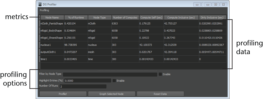 Profiling is a process that computes how much time and resources are used to complete certain processes. It is useful for finding inefficiencies in code that slow down productivity. The DG Profiler is accessed through the API and uses the MFnDependency Node class. It allows you to identify which nodes consume too much processing time, and then reduce unnecessary calls, or otherwise improve process efficiency. Profiling also allows you to filter each node by its specific metrics while working in a scene. The DG Profiler does not measure memory used by data being copied or calculated by the dependency graph (DG).