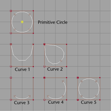 Of the six curves in the illustration, the first is a circle primitive with four spans. Notice how the circle does not touch the hull. The next five curves are attempts at replicating this geometry using the curve building tools in Maya.