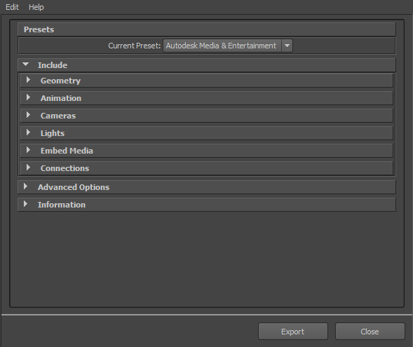 6. Set the export options you want to use or select a preset from the Presets menu. The Autodesk Media and Entertainment preset contains the best balance of options for a general animation workflow. The Autodesk MotionBuilder preset contains options set for character animation using Maya and MotionBuilder.