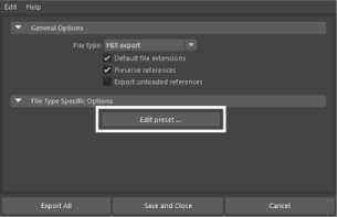 The FBX plug-in stores custom presets in a file so you can share them. By default, you can find custom preset files in your \maya\FBX\Presets directory.