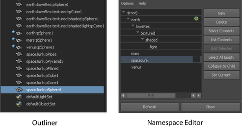 The next two procedures show you how to remove nodes from an existing namespace in a scene using the