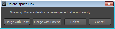 When removing namespaces, you have the option to merge referenced or imported object namespaces with a namespace that exists in the parent scene. When duplicate namespaces occur, the namespaces are merged and duplicate object names are incrementally suffixed with a number.