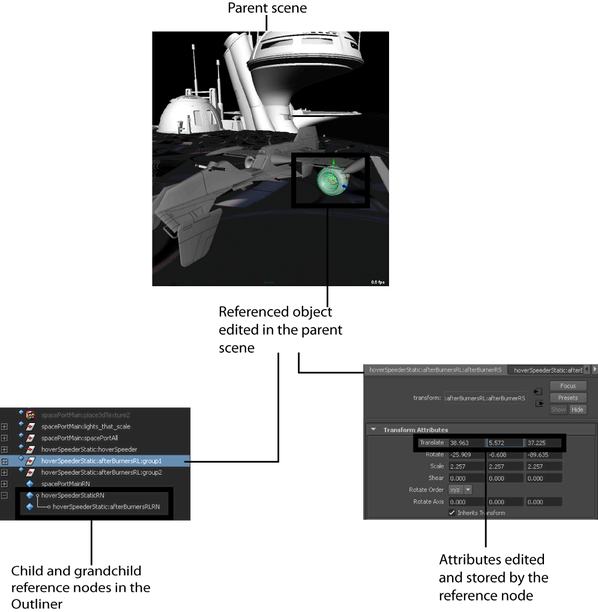 Reference edits made in the parent scene do not propagate to the original child scene file so it remains unmodified. For example, a tree that is referenced into the parent scene can be scaled and repositioned without the original tree reference file being affected. It appears scaled and repositioned only in the parent scene because the translations and scale attributes are being stored in a reference node within the parent scene.