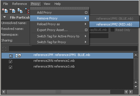 Reload Proxy As is used to switch between proxy references for a given file reference. The list of available proxy references is displayed in the menu based on their proxy tags. When a proxy tag appears in gray, it indicates that it is currently loaded.