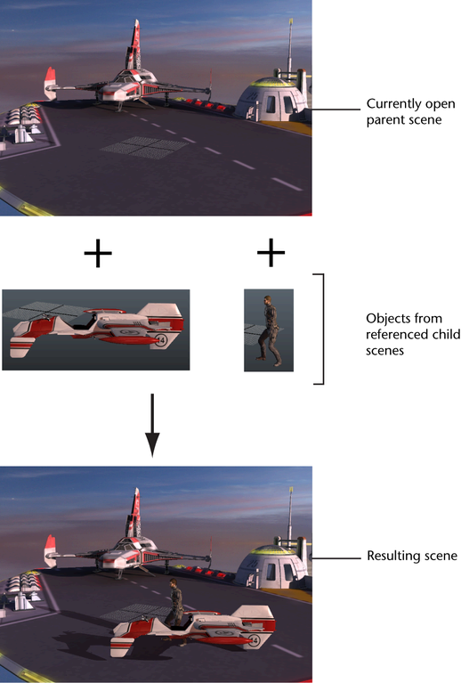 A scene file that references other files is known as a parent scene to indicate its position within the file referencing hierarchy. A parent scene reads or references other files called child scenes. Even though the referenced child scenes appear in the parent scene, the child scene data remain separate from the parent scene at all times.