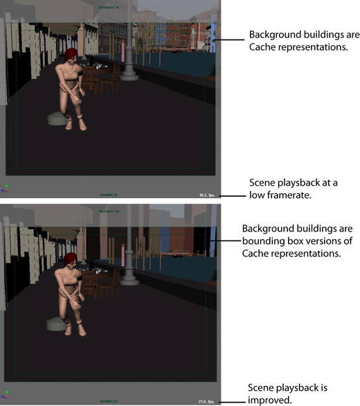 You can convert complex objects in your scene to bounding boxes, then use these objects as simple, pre-visualization Scene or Cache representations. Setting up a scene with bounding boxes also increases playback speed and decreases memory use. For example, you can tweak keyframe animation for a character directly in the context of a full city scene.