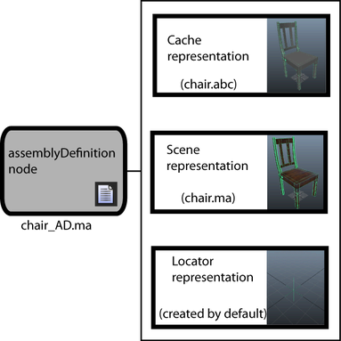 Information about your production asset and its various Assembly representations is stored in an assembly definition (assemblyDefinition node). Assembly definitions let you switch between the different representations of the production asset. A Maya scene can contain only one assemblyDefinition node, so each assembly definition must be as saved as a separate .ma or .mb scene file. (See Create an assembly definition.)