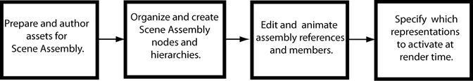 You can use Scene Assembly in principle areas of your production pipeline, including asset authoring, set construction, shot layout, animation, lighting, and rendering. Before using Scene Assembly in your workflows, it is important that you first organize your production assets and have a good idea of how you want to use them. The following sections briefly describe how you can use Scene Assembly in the principle areas of a production pipeline.
