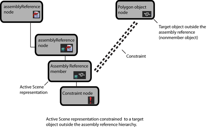 When a top-level assemblyReference node is the target or constrained object, the behavior of the constraint persists when representations are switched. For example, if the assemblyReference node is constrained to a target object, the constraint behavior does not change when assembly representation switches from a Scene representation to a Cache representation.