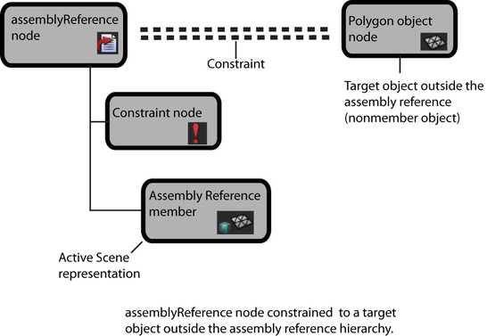 In this case, the constrained object (the assembly reference node) is not unloaded from the scene, which maintains the connections with the constraint node and allows the constraint behavior to persist.