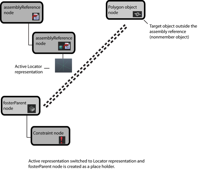 In this cases, switching representations causes the constrained object to be unloaded from the scene. Maya then creates a fosterParent node to temporarily stand in for the unloaded assemblyReference node or assembly reference member. The constrained object returns to its unconstrained location and behavior until the assembly reference node or member is reloaded.