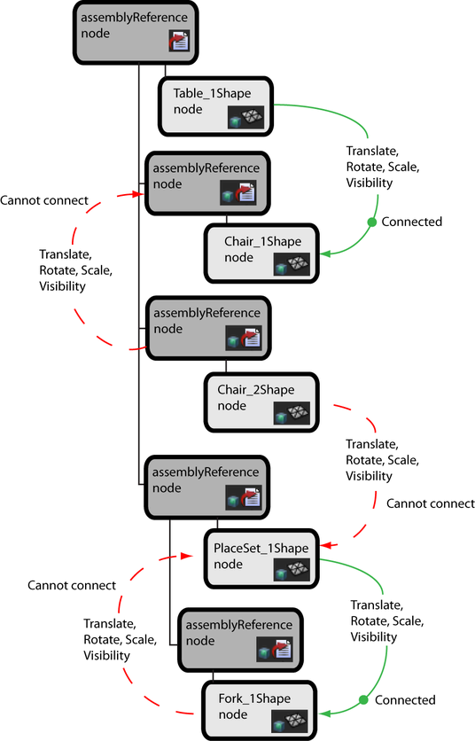 To connect attributes between nodes, the source nodes must be in a higher level of the assembly reference hierarchy than the destination node. Attribute connections cannot be made between nodes that are at the same level of the node hierarchy. You can also make attribute connections between shape nodes that make up a Scene representation. For example, if a Table.ma Scene representation had four polygonShape nodes for each table leg, you can connect their Transform attributes. Attributes connected in a nested file can be disconnected at any time.