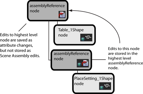 All edits you make to the lower level nested nodes in the Scene Assembly hierarchy are stored in the top-level assemblyReference node, but the top-level node does not store edits to its own attributes. Changes to the top-level node attributes are saved as regular attribute changes in the scene file, but they not stored as Scene Assembly edits.
