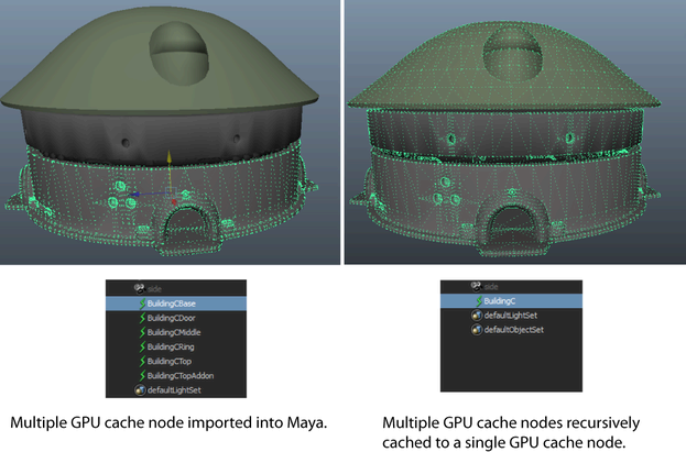 You can import a number of GPU caches into your scene, then export all the objects in a single GPU cache file. This caching workflow solves many performance issues that arise while working with large scenes with heavy data sets. For example, you can select grouped geometry and export each group to a GPU cache. You can then assemble your scene by importing the GPU caches and export the entire scene to a single GPU cache file.