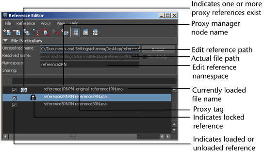 The Reference Editor lets you manage the file and proxy references in your scene.
