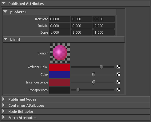 With the Asset Editor you can publish swatches (for example, a swatch for a blinn shading node) by publishing the node’s associated message attribute. Swatches provide you with visual feedback on shading node properties.