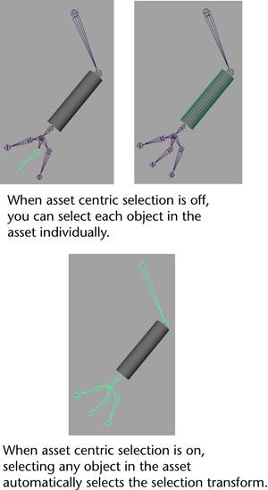 For assets with no transform, you can customize Maya to select the first published node of an asset (the selection transform, the first parent, or the first child in that order) whenever any node in an asset is selected in the main scene. This is useful in complex scenes, especially with hierarchies, where you usually only want to ever select the highest level parent in the asset.