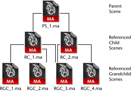 Parent scenes can reference other parent scenes to create a hierarchy of nested references. A parent scene can both reference other files and be a referenced child of another parent scene based on its relative position within the file referencing hierarchy. When this occurs, the child scene files are referred to as grandchild scene files. This hierarchical referencing of a parent scene, child scenes, and other grandchild files is referred to as multi-level referencing.