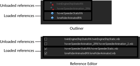 You can load and unload references from the Outliner or Reference Editor. See Load and unload file references.