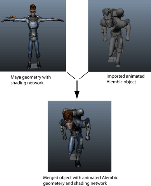 When importing an Alembic cache, you can merge the cached objects with their original Maya objects. When merged, the Alembic geometry replaces the original objects in the scene. The Alembic object's animation data is preserved and it inherits shading data from the scene object. To be merged, the Alembic objects must have the same name and object hierarchy as the source geometry. The topologies of the scene and Alembic objects do not need to match.