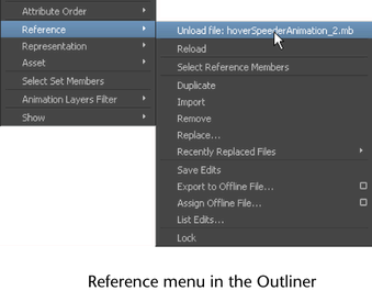 There are a number of options you can use to manage and modify file references and their contents. These options are available from the Reference menu in the Outliner or Reference Editor. They include: