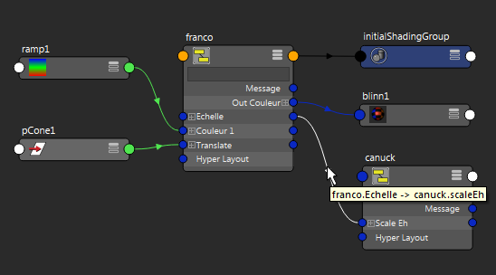 In this example, Scale Eh is a published attribute for the canuck asset and is therefore visible and available for connecting to other nodes. Other non-published attributes of member nodes are hidden.