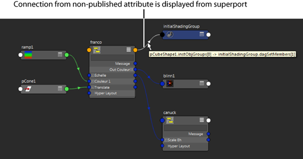 Non-published attributes are hidden from the asset, but their connections are visible. The Node Editor displays the connection from the superport, and you can place your mouse over the connection line to see the details of the connection.