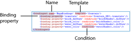A template can have one or more binding sets associated with it. A binding set is a mapping of published names (binding properties) mapped to node attributes (conditions). This mapping is used by the Autobind feature to quickly publish and bind attributes in any asset that uses this template.