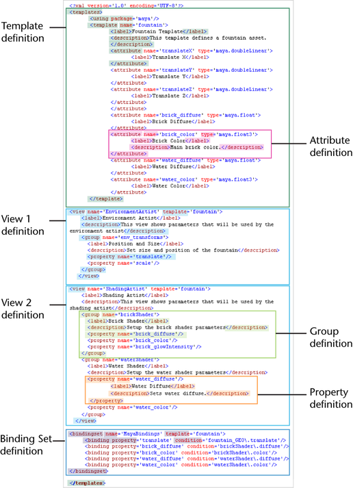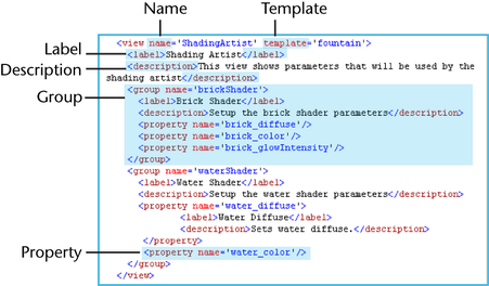 <view name='ShadingArtist' template='fountain'> <label>Shading Artist</label> <description>This view is for the shading team. </description> <group name='Water_Shader'> <property name='water_diffuse'/> <property name='water_color'/> </group> </view>